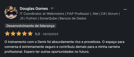 Bem, como alguns de vocês já sabem, faz um bom tempo que trabalho como líder na área de TI e formo líderes dos mais diversos níveis. Acredito que posso contribuir significativamente durante a sua trajetória.